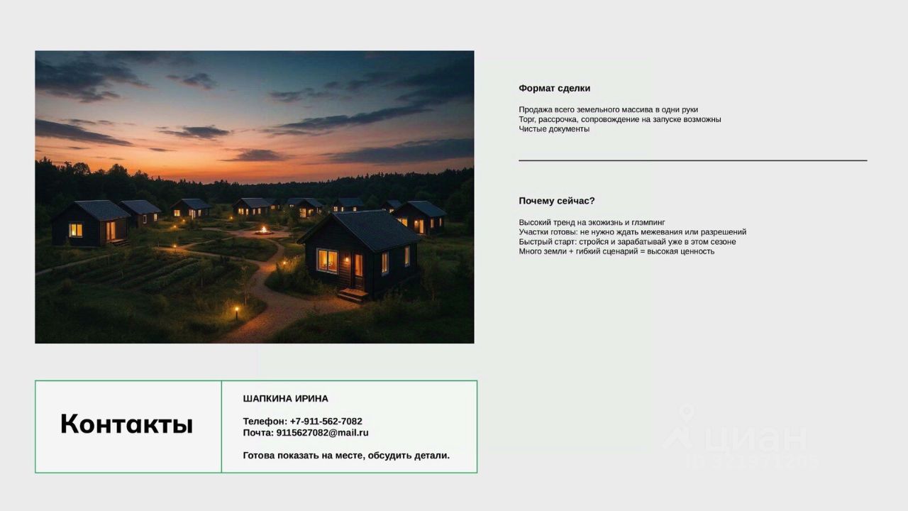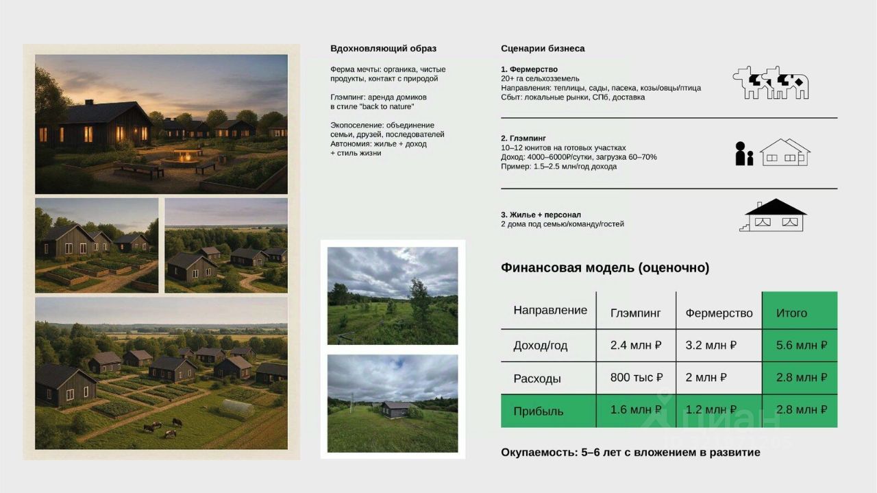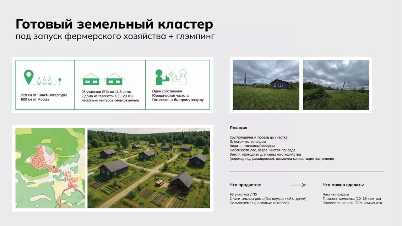 Синергия активов: Идеальное сочетание земель под застройку (ЛПХ) и для коммерческой деятельности (сельхозназначение). Возможность создать автономный комплекс с замкнутым циклом. Масштаб: Крупнейшее предложение в регионе. Позволяет реализовать проект, не имеющий аналогов. Готовая концепция: Земля идеальна под: Агротуристический кластер (эко-отель, ферма, ресторан, вип-коттеджи) Эко-поселение или коттеджный поселок формата ''фермерский хутор'' Сельхозпредприятие с жилым комплексом для сотрудников Корпоративный ретрит-центр и база отдыха Развитая территория: Наличие построек сокращает сроки и затраты на запуск первой очереди проекта. Все юридически чисто: Единый собственник. Полный пакет документов готов для проверки.