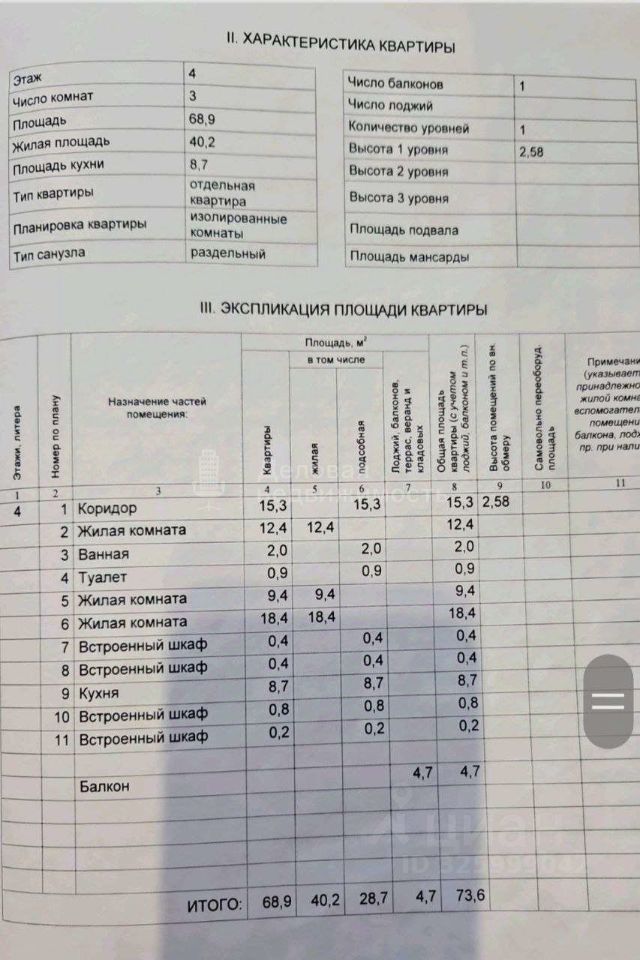 • Общая площадь квартиры 68.9 кв.м.
