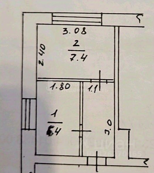 Общая площадь 16,1 кв.м, площадь комнаты 7,4 кв.м, кухня 5,4 кв.м.